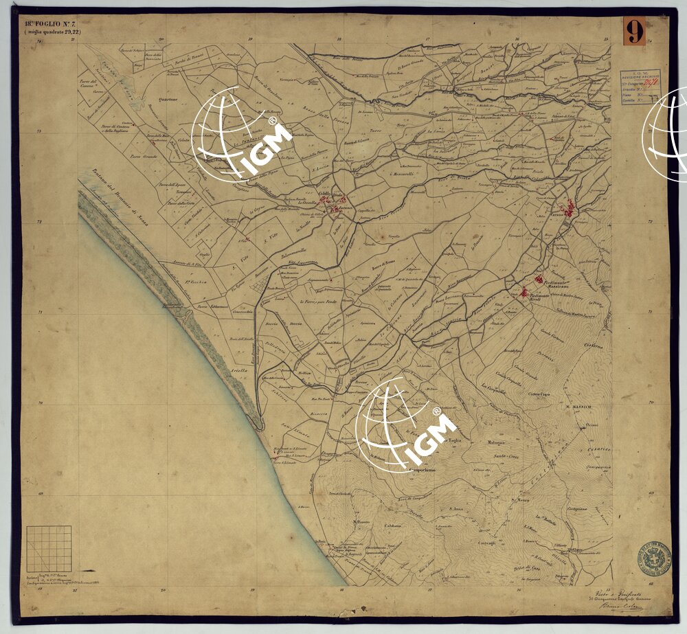 Sono 167 tavolette montate su tela o seta, copiate e messe in netto all’Officio Topografico di Napoli su le levate eseguite dal 1834 al 1860 per la formazione della Carta del Reame di Napoli alla scala di 1:80.000. L’esecuzione di questa carta venne decretata nel 1814: essa fu però iniziata, dati i movimenti politici di quell’epoca, soltanto nel 1833. Queste tavolette si riferiscono ai fogli 1, 5, 8, 9, 12, 13, 17-19, 28, 29, 33 della suddetta carta la quale doveva essere disegnata ed incisa su rame a bulino in fogli rettangolari delle dimensioni di m. 0,55×0,82, con orografia a tratteggio e curve di livello tracciate alla equidistanza di 10 passi (m. 18,52) o di 52 passi (m. 92,60). Di essa peraltro furono pubblicati solamente cinque fogli, cioè: Napoli, Caserta, Gaeta, Leonessa, Cittaducale, tra il 1861 e 1870. L’I.G.M. conserva i rami dei primi tre di questi fogli. La carta all’80.000, pregevolissima per valore artistico e scientifico, venne giudicata superiore alle altre produzioni cartografiche contemporanee non solo italiane, ma europee (cfr. Mori A., La cartografia ufficiale in Italia e l’I.G.M. 1922, pag.107).