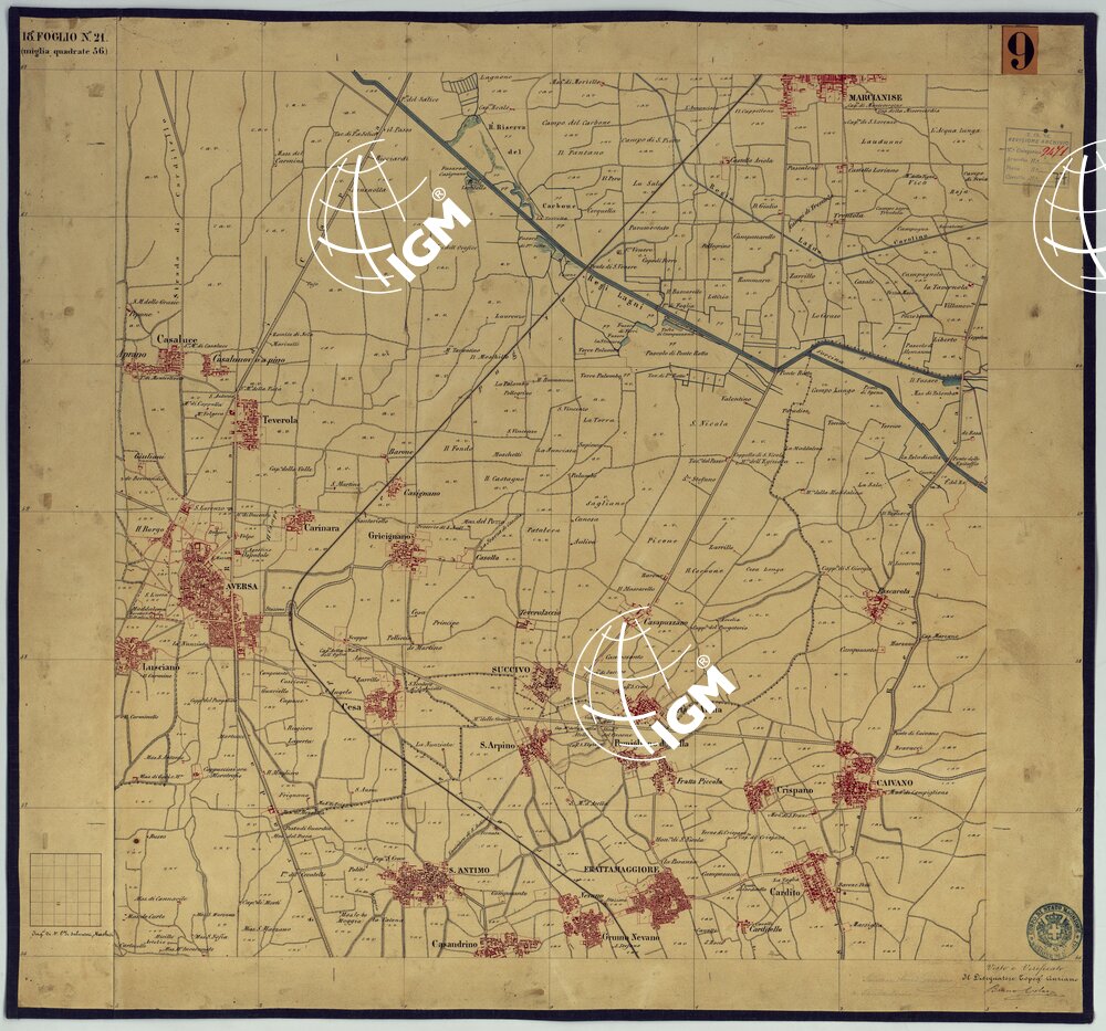 Sono 167 tavolette montate su tela o seta, copiate e messe in netto all’Officio Topografico di Napoli su le levate eseguite dal 1834 al 1860 per la formazione della Carta del Reame di Napoli alla scala di 1:80.000. L’esecuzione di questa carta venne decretata nel 1814: essa fu però iniziata, dati i movimenti politici di quell’epoca, soltanto nel 1833. Queste tavolette si riferiscono ai fogli 1, 5, 8, 9, 12, 13, 17-19, 28, 29, 33 della suddetta carta la quale doveva essere disegnata ed incisa su rame a bulino in fogli rettangolari con orografia a tratteggio e curve di livello tracciate alla equidistanza di 10 passi (m. 18,52) o di 52 passi (m. 92,60). Di essa peraltro furono pubblicati solamente cinque fogli, cioè: Napoli, Caserta, Gaeta, Leonessa, Cittaducale, tra il 1861 e 1870. L’I.G.M. conserva i rami dei primi tre di questi fogli. La carta all’80.000, pregevolissima per valore artistico e scientifico, venne giudicata superiore alle altre produzioni cartografiche contemporanee non solo italiane, ma europee (cfr. Mori A., La cartografia ufficiale in Italia e l’I.G.M. 1922, pag.107).