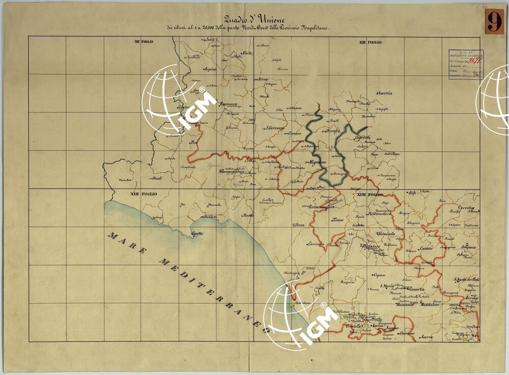 Sono 167 tavolette montate su tela o seta, copiate e messe in netto all’Officio Topografico di Napoli su le levate eseguite dal 1834 al 1860 per la formazione della Carta del Reame di Napoli alla scala di 1:80.000. L’esecuzione di questa carta venne decretata nel 1814: essa fu però iniziata, dati i movimenti politici di quell’epoca, soltanto nel 1833. Queste tavolette si riferiscono ai fogli 1, 5, 8, 9, 12, 13, 17-19, 28, 29, 33 della suddetta carta la quale doveva essere disegnata ed incisa su rame a bulino in fogli rettangolari con orografia a tratteggio e curve di livello tracciate alla equidistanza di 10 passi (m. 18,52) o di 52 passi (m. 92,60). Di essa peraltro furono pubblicati solamente cinque fogli, cioè: Napoli, Caserta, Gaeta, Leonessa, Cittaducale, tra il 1861 e 1870. L’I.G.M. conserva i rami dei primi tre di questi fogli. La carta all’80.000, pregevolissima per valore artistico e scientifico, venne giudicata superiore alle altre produzioni cartografiche contemporanee non solo italiane, ma europee (cfr. Mori A., La cartografia ufficiale in Italia e l’I.G.M. 1922, pag.107).