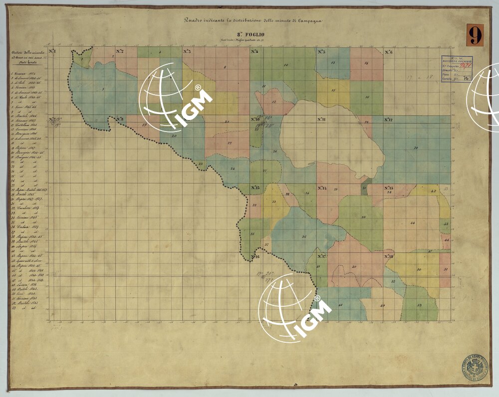 TAVOLETTE AL 20.000 PER LA CARTA DEL REGNO DI NAPOLI – FOGLIO 8° QUADRO INDICANTE LA DISTRIBUZIONE DELLE MINUTE DI CAMPAGNA.
