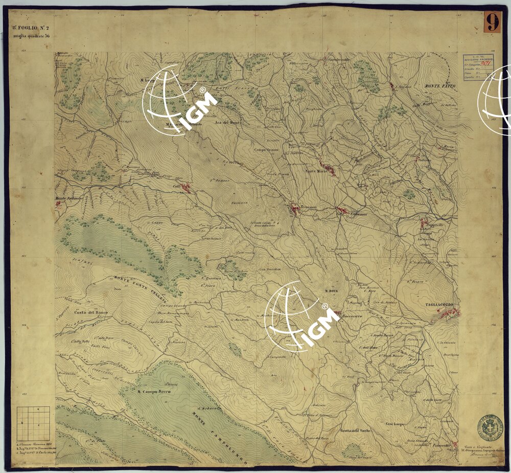 Sono 167 tavolette montate su tela o seta, copiate e messe in netto all’Officio Topografico di Napoli su le levate eseguite dal 1834 al 1860 per la formazione della Carta del Reame di Napoli alla scala di 1:80.000. L’esecuzione di questa carta venne decretata nel 1814: essa fu però iniziata, dati i movimenti politici di quell’epoca, soltanto nel 1833. Queste tavolette si riferiscono ai fogli 1, 5, 8, 9, 12, 13, 17-19, 28, 29, 33 della suddetta carta la quale doveva essere disegnata ed incisa su rame a bulino in fogli rettangolari con orografia a tratteggio e curve di livello tracciate alla equidistanza di 10 passi (m. 18,52) o di 52 passi (m. 92,60). Di essa peraltro furono pubblicati solamente cinque fogli, cioè: Napoli, Caserta, Gaeta, Leonessa, Cittaducale, tra il 1861 e 1870. L’I.G.M. conserva i rami dei primi tre di questi fogli. La carta all’80.000, pregevolissima per valore artistico e scientifico, venne giudicata superiore alle altre produzioni cartografiche contemporanee non solo italiane, ma europee (cfr. Mori A., La cartografia ufficiale in Italia e l’I.G.M. 1922, pag.107).