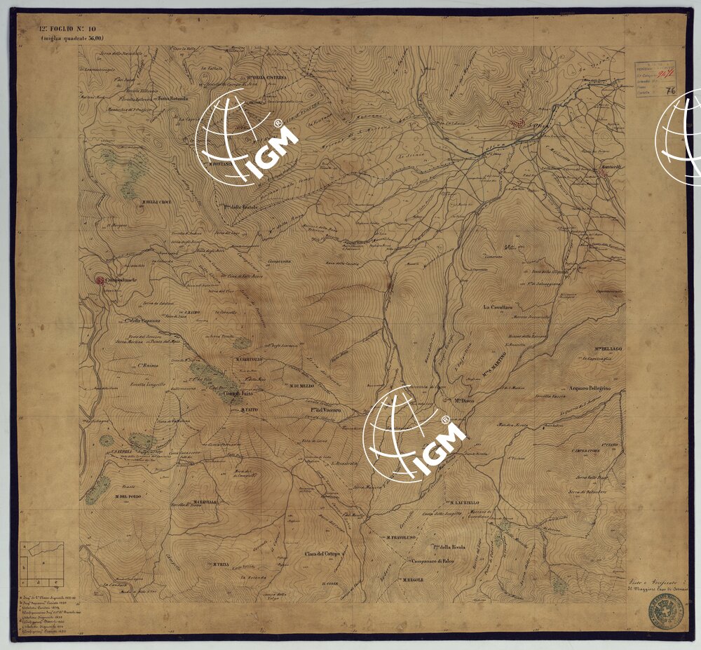 Sono 167 tavolette montate su tela o seta, copiate e messe in netto all’Officio Topografico di Napoli su le levate eseguite dal 1834 al 1860 per la formazione della Carta del Reame di Napoli alla scala di 1:80.000. L’esecuzione di questa carta venne decretata nel 1814: essa fu però iniziata, dati i movimenti politici di quell’epoca, soltanto nel 1833. Queste tavolette si riferiscono ai fogli 1, 5, 8, 9, 12, 13, 17-19, 28, 29, 33 della suddetta carta la quale doveva essere disegnata ed incisa su rame a bulino in fogli rettangolari con orografia a tratteggio e curve di livello tracciate alla equidistanza di 10 passi (m. 18,52) o di 52 passi (m. 92,60). Di essa peraltro furono pubblicati solamente cinque fogli, cioè: Napoli, Caserta, Gaeta, Leonessa, Cittaducale, tra il 1861 e 1870. L’I.G.M. conserva i rami dei primi tre di questi fogli. La carta all’80.000, pregevolissima per valore artistico e scientifico, venne giudicata superiore alle altre produzioni cartografiche contemporanee non solo italiane, ma europee (cfr. Mori A., La cartografia ufficiale in Italia e l’I.G.M. 1922, pag.107).