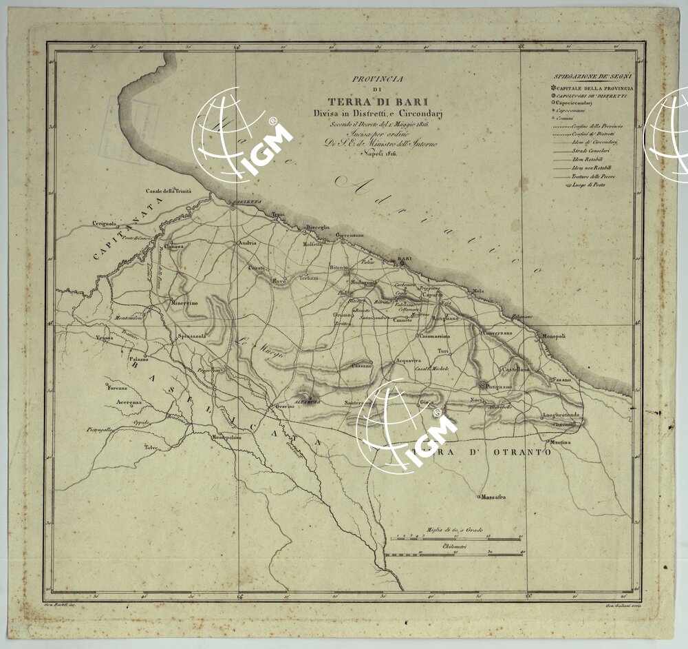 ATLANTE DELLE QUINDICI PROVINCIE AL DI QUA DEL FARO DEL REGNO DELLE DUE SICILIE A NORMA DELLA LEGGE DEL 1° MAGGIO 1816. INCISE D’ORDINE DI S. E. IL SEGRETARIO DI STATO MINISTRO DEGLI AFFARI INTERNI DA GENNARO BARTOLI – PROVINCIA DI TERRA DI BARI.