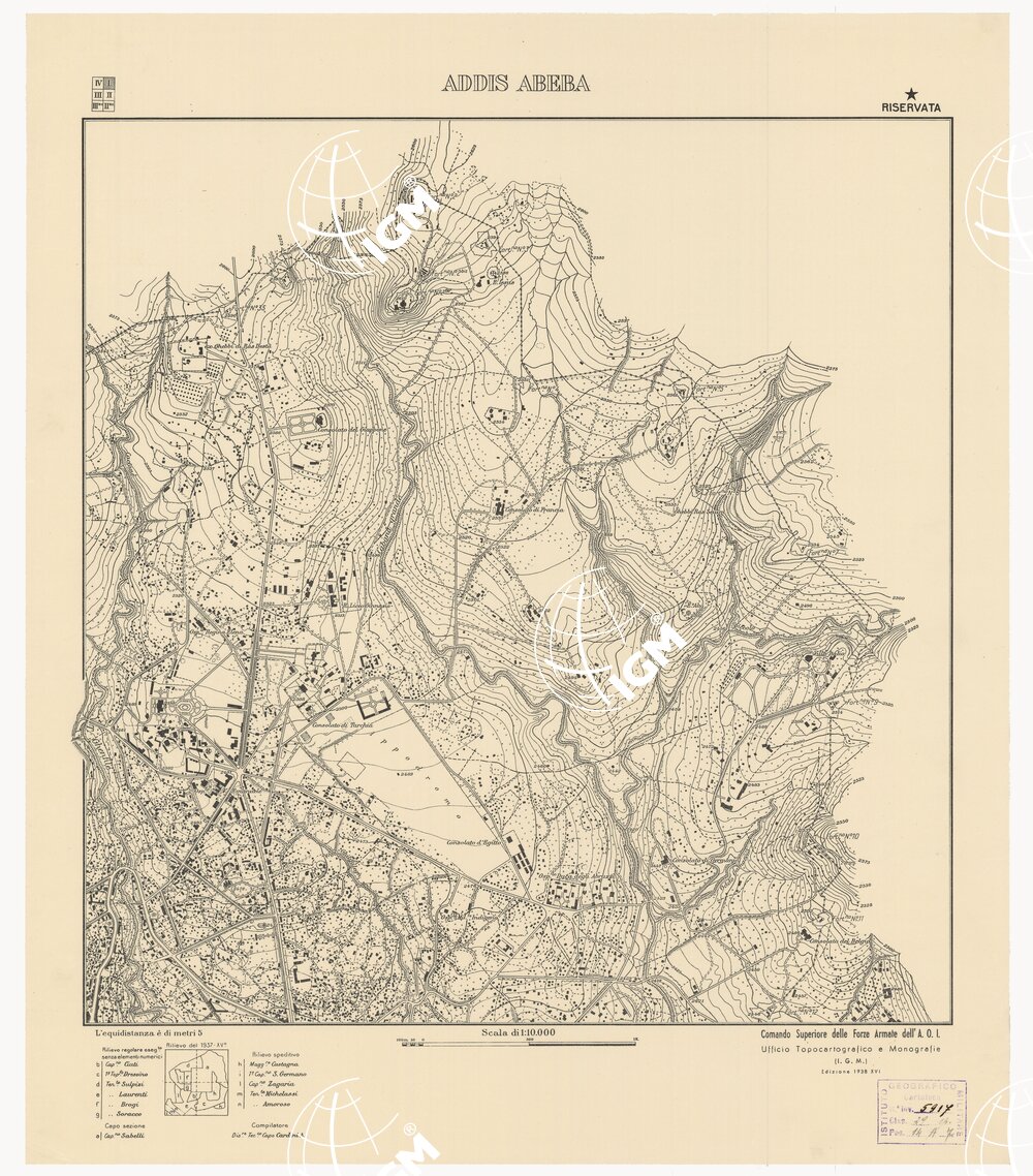 Rappresentazione orografica a curve di livello, l’equidistanza è di metri 5. Comando Superiore delle Forze Armate dell’A.O.I., Ufficio Topocartografico e Monografie (I.G.M.).