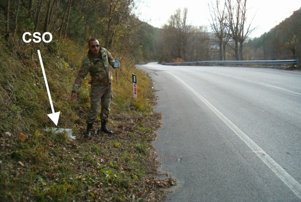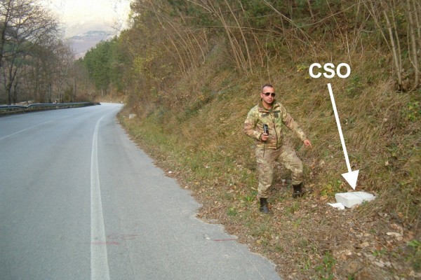[{"simbolo_contrassegno":"P4","materializzazione":"(CSO) – Pozzetto in cemento (S.G.N.) interrato a margine strada, lato monte, al Km 16,026."},{"simbolo_contrassegno":"B4","materializzazione":"(CSO') – Centrino universale posto sul muro di scarpa, al Km 16,050 della S.S.17 bis."}]