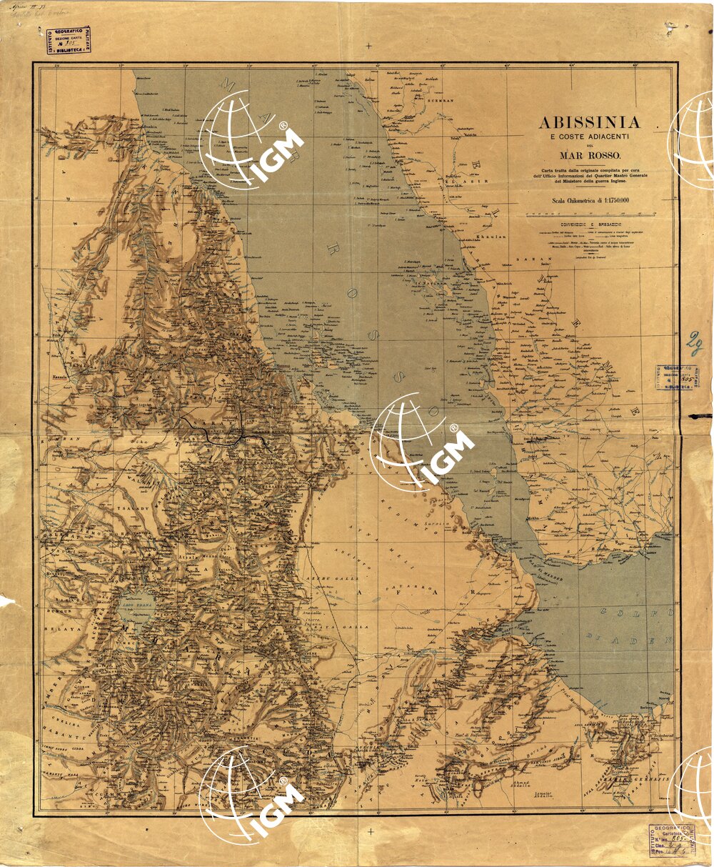 Carta in un foglio a colori con orografia dimostrata a sfumo in bistro, acque in azzurro, scritture in nero. Vi sono tracciati i confini politici, le linee di comunicazione, gli itinerari degli esploratori, le linee telegrafiche. La carta fu pubblicata in seguito all’occupazione italiana di Massaua; venne ridotta dalla Map of Abyssinia and adjacent Red Sea coast, alla scala di 1:584.000 portandovi alcune modificazioni e varianti. Essa comprende il territorio fra i paralleli 9° e 20′ e i meridiani 36° e 45° (long. est da Greenwich).