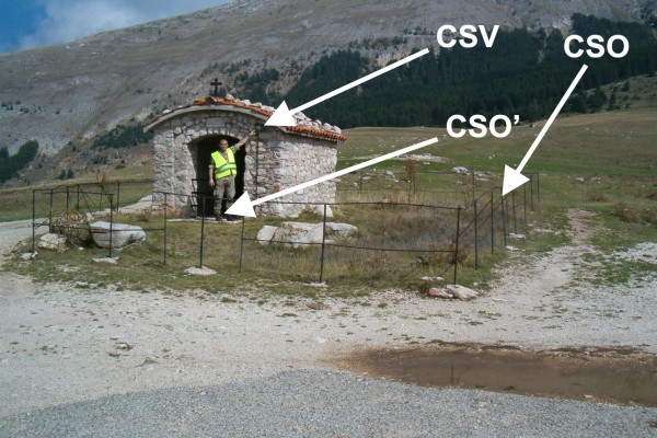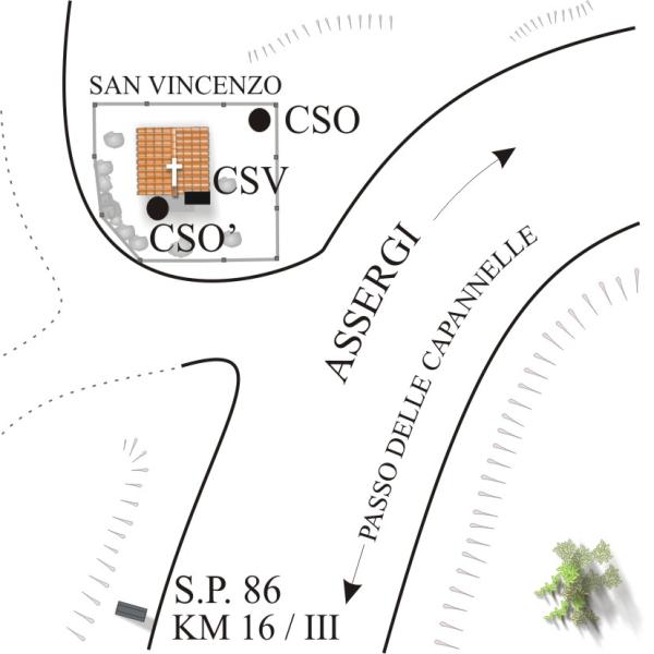 | Contrassegni | [{"simbolo_contrassegno":"P4","materializzazione":"(CSO) – Pozzetto in cemento posto nello spigolo laterale destro dell'area recintata dell'edicola votiva."},{"simbolo_contrassegno":"B2","materializzazione":"(CSO') – Chiodino anonimo, cementato sul pavimento all'ingresso della Cappella a San Vincenzo."},{"simbolo_contrassegno":"V2","materializzazione":"(CSV) – Piastrina con cilindretto infissa sulla facciata principale della Cappella in alto sulla destra dell'accesso alla stessa."}] |