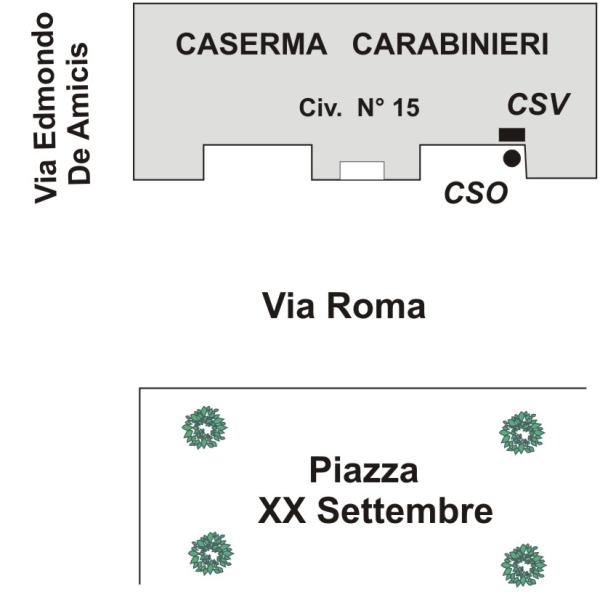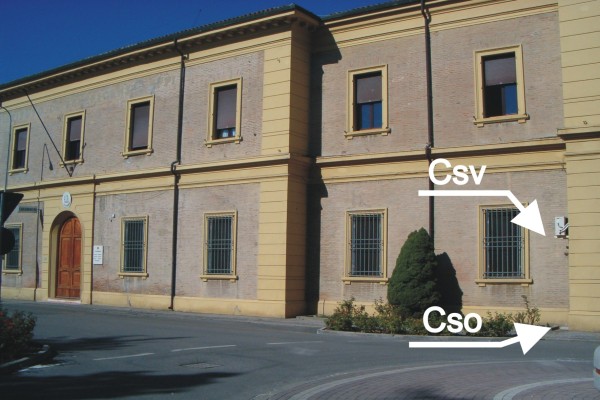 | Contrassegni | [{"simbolo_contrassegno":"P1","materializzazione":"(CSO) Chiusino in ghisa protetto da coperchio anonimo in cemento 40×40, posto nella risega a destra della porta d'ingresso. Il contrassegno fa parte della Rete Emilia Romagna – Rete Regionale di Controllo della Subsidenza n\u00b0000370."},{"simbolo_contrassegno":"V1","materializzazione":"(CSV) – Mensola infissa in corrispondenza del cso."}] |