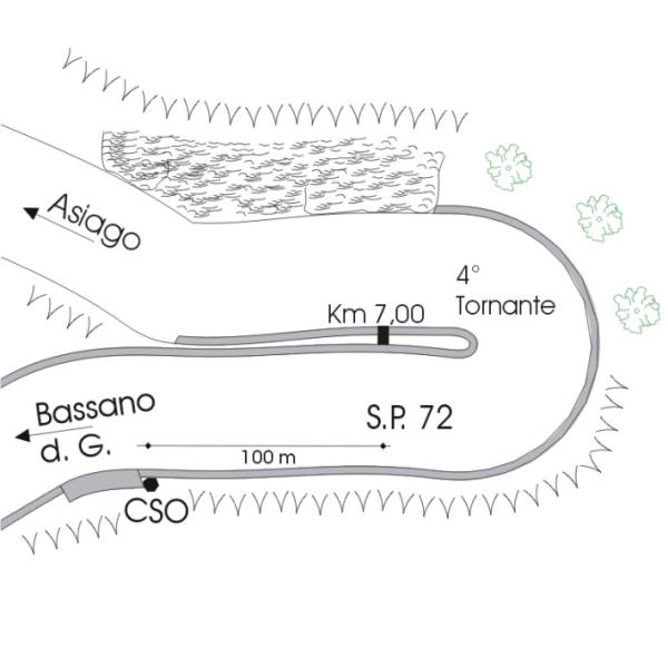 | Contrassegni | [{"simbolo_contrassegno":"B1","materializzazione":"(CSO) – Bullone infisso nella parete laterale, lato verso monte, del muro a retta in cemento armato, pi\u00f9 spesso, di valle della strada posto 100 metri dopo il tornante n\u00b0 4 venendo da Asiago, al km 6,900."}] |