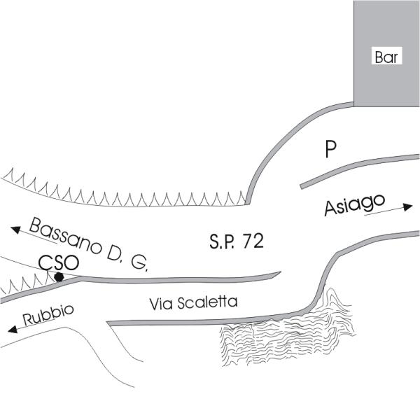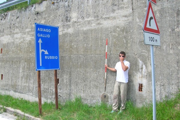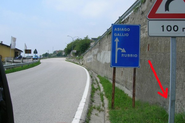 [{"simbolo_contrassegno":"B1","materializzazione":"(CSO) – Bullone infisso sul muro a retta, in cemento armato a monte della strada, appena dopo l' incrocio per Rubbio venendo da Asiago, all' altezza del km 12,100."}]