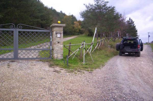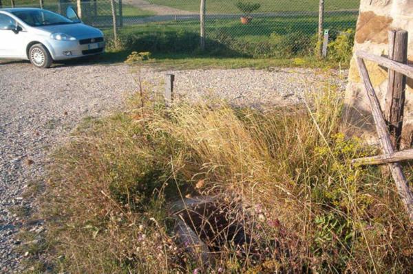 Centrino in acciaio inox infisso sul muro del tombino stradale posto a destra del cancello di accesso alla Villa Cerchiai.