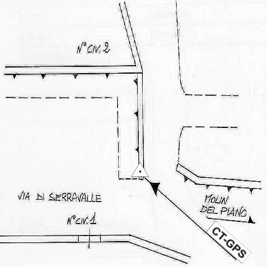 | Materializzazione | Centrino in acciaio inox infisso sulla testa del muro di sostegno della strada in Via di Serravalle nella zona artigianale di Molin del Piano. |