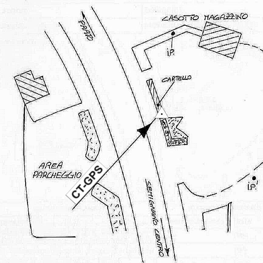 Centrino in acciaio inox murato sul cordolo del marciapiede in cemento posto a delimitazione dell'area di parcheggio, al limitare dell'abitato di Schignano, lungo la strada provinciale con conduce da Schignano a Prato. Da Vaiano prendere per Schignano.