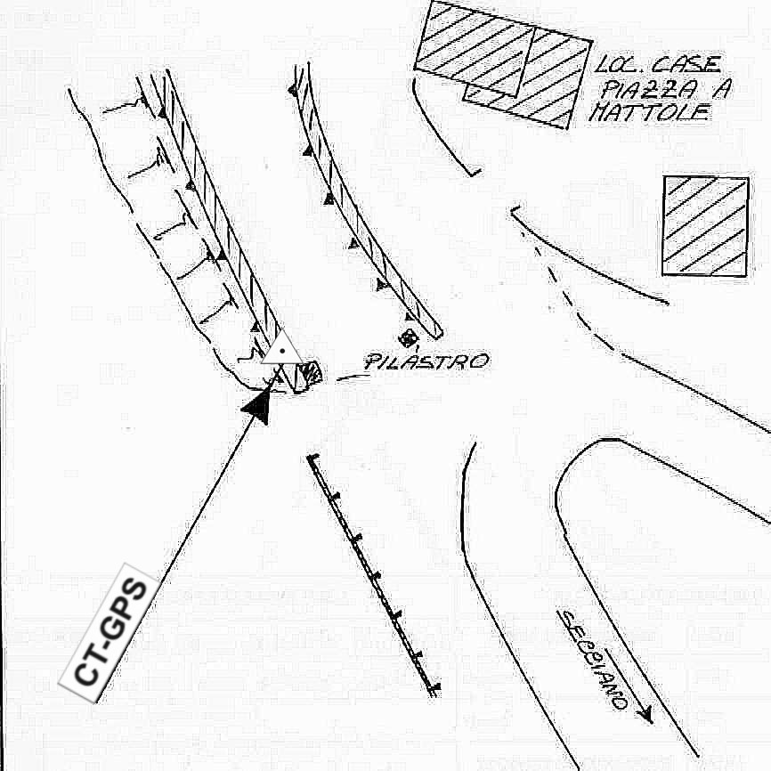 | Materializzazione | Centrino in acciaio inox infisso sul muretto di protezione presso l'accesso alle case di Piazza a Mattole, accesso da Secciano paese (Tabernacolo). |