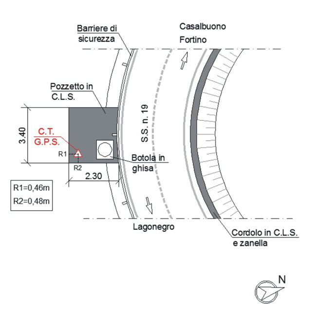| materializzazione | Centrino metallico orizzontale di tipo chiodo con rondella ARPAB Regione Basilicata infisso sulla sommità della soletta in C.L.S. del pozzetto. |