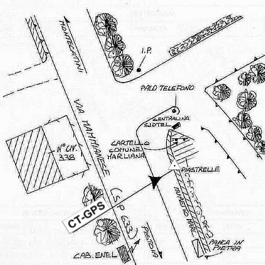 | Materializzazione | Centrino in acciaio inox infisso sulla sommità del muretto che delimita un'area di parcheggio in Via Mammianese, davanti al civico 338. |