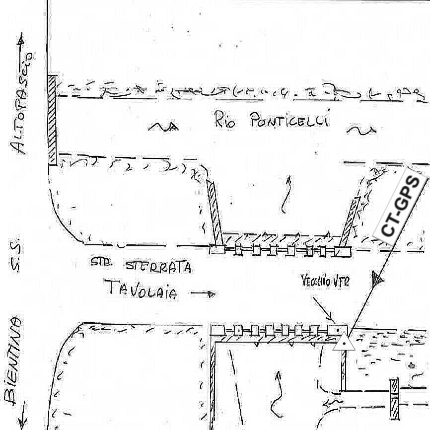 | Materializzazione | Centrino in acciaio inox murato sulla spalla sud – est del primo ponticello posto sulla strada sterrata che costeggia la sponda sud del Rio Ponticelli e porta a Tavolaia. |