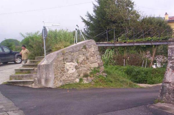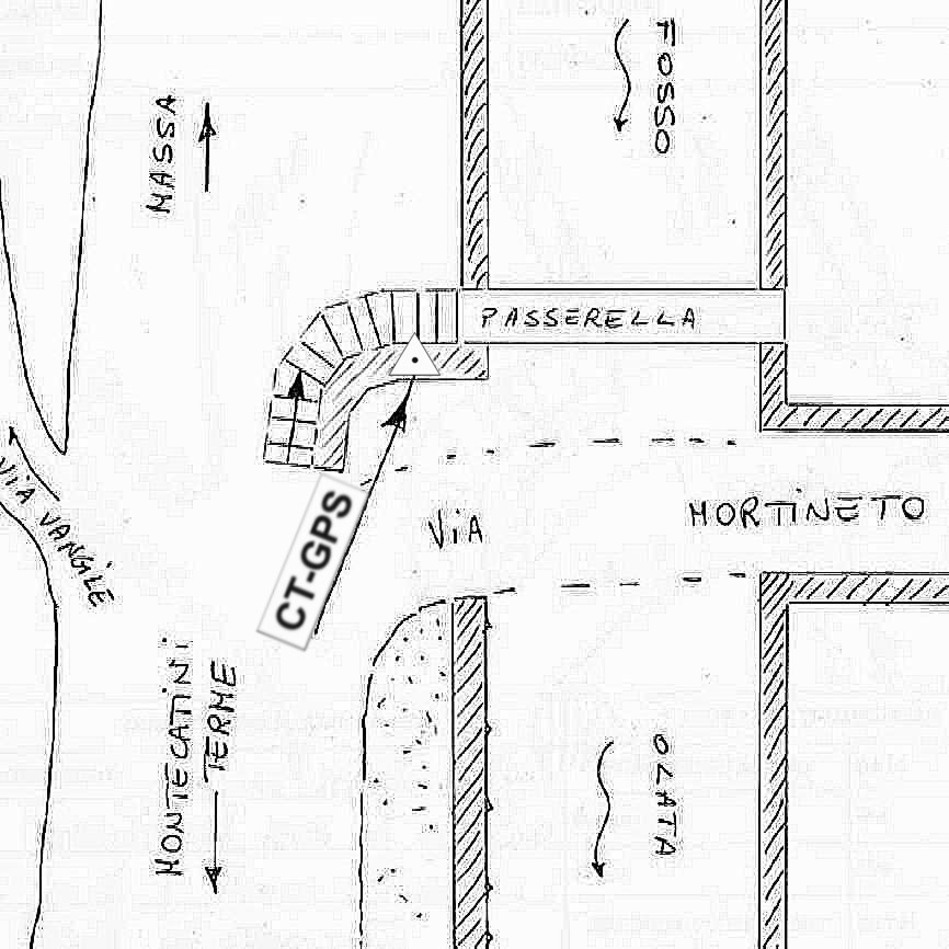 | Materializzazione | Centrino in acciaio inox cementato alla sommità del muro di sostegno a fianco di una gradinata di accesso ad una passerella pedonale sul Fosso Volata. |
