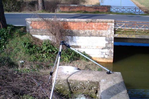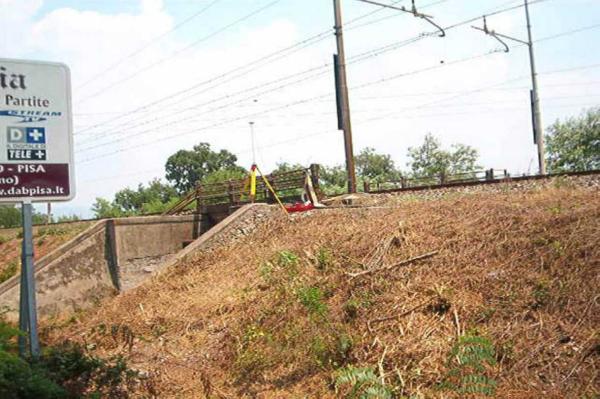 Centrino in acciaio inox murato in asse con lo spigolo del muro, facente parte del ponticello ferroviario.