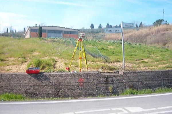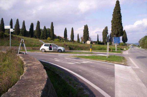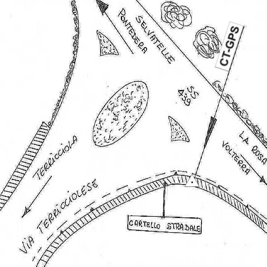 Centrino in acciaio inox infisso sul muro di sostegno all'altezza del bivio della strada S.S. n° 439 ( al km 73 + 900 circa ) con la strada " Via Terricciolese " che porta a Terricciola.
