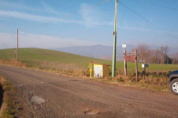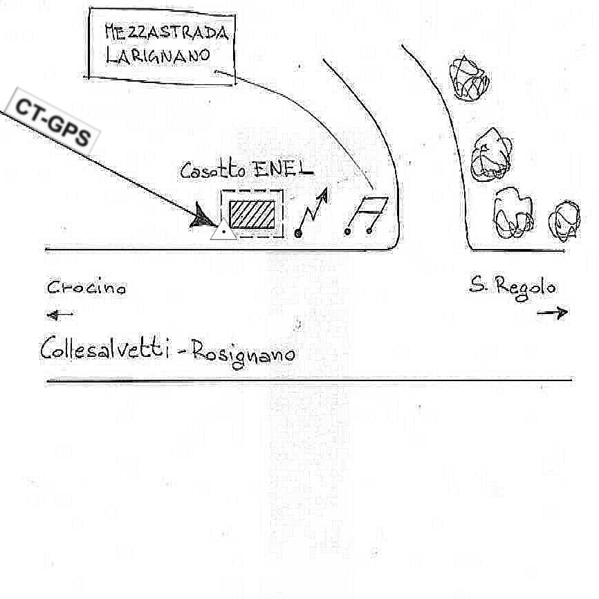 Centrino in acciaio inox murato su platea in cemento del piccolo casotto ENEL, posto in via San Regolo al bivio con cartello turistico in legno recante la scritta " Casini di Larignano ".