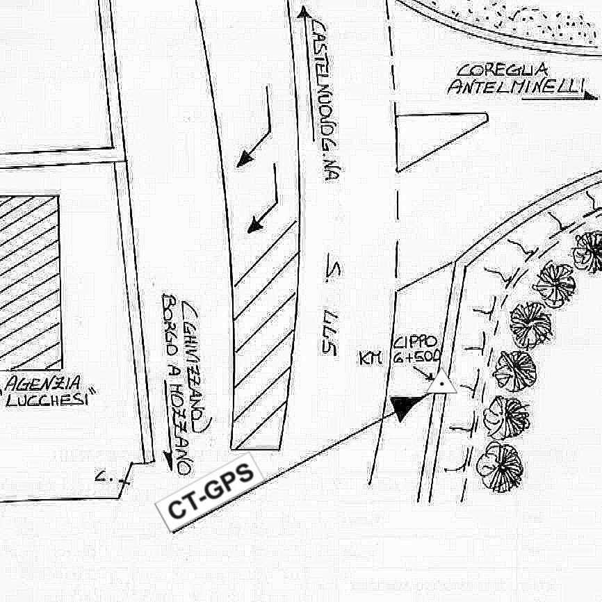 | Materializzazione | Centrino GPS della Regione Toscana in acciaio inox infisso sulla sommità del muro di contenimento a bordo strada lungo la S.R. 445 della Garfagnana davanti al cippo del Km 6+500 e poco prima dell'incrocio per Coreglia Antelminelli e alla fine del paese di Ghivizzano. |