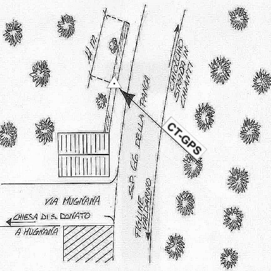 | Materializzazione | Centrino in acciaio inox murato sul muro di contenimento della strada in localià " Mugnana ", nel comune di Greve in Chianti. |