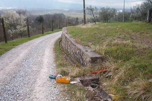 | Materializzazione | Centrino in acciaio inox murato sula manufatto in cemento del tombino della canaletta presso il muro di sostegno dell'inizio del vialetto che porta a Castel De Rossi. |