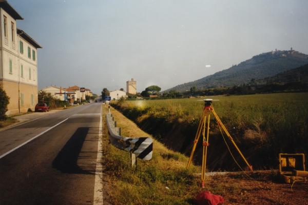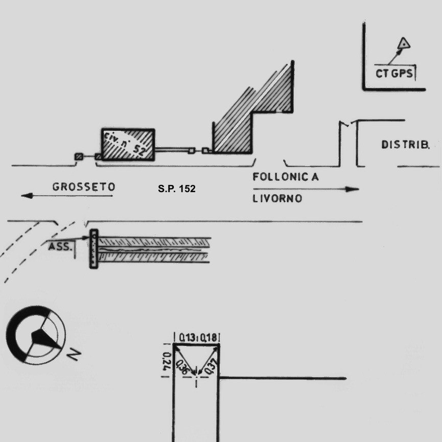 Centrino del tipo "GPS D" infisso sul cordolo in cemento del ponticello del canale che costeggia la SP 152 (ex Statale Aurelia Sud) Km. 9,400, in prossimità dell'abitato di Braccagni all'altezza del civico 52.