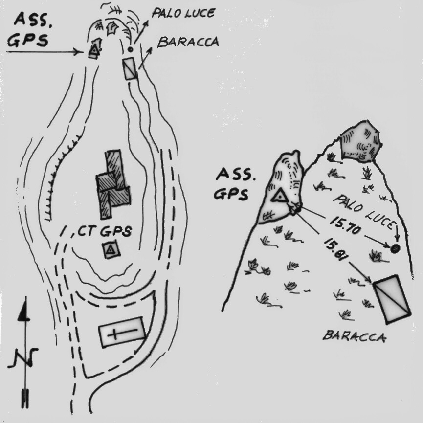 | materializzazione | Centrino del tipo "GPS D" fissato alla sommità della roccia affiorante a nord del rilievo su cui è ubicata la Torre di Aliforni. |
