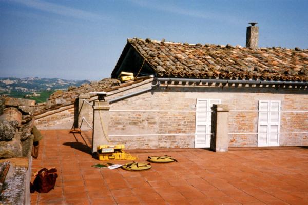 Centrino in accaio inox del tipo "GPS D" fissato alla sommità, in corrispondenza dell'asse geometrico, del pilastrino d'angolo per l'ancoraggio della ringhiera di coronamento della terrazza del convento.