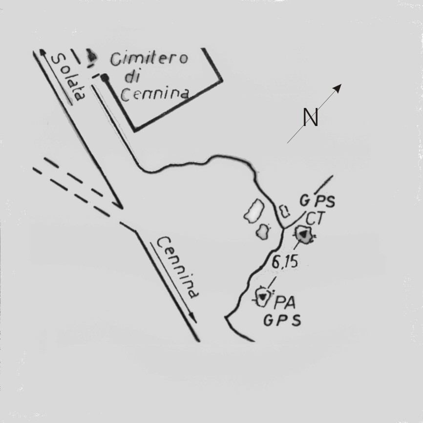 | Materializzazione | Centrino del tipo "GPS D" fissato su roccia affiorante sul margine est dello spazio sterrato adiacente il cimitero di Cennina a circa m.6,12 a sud. |