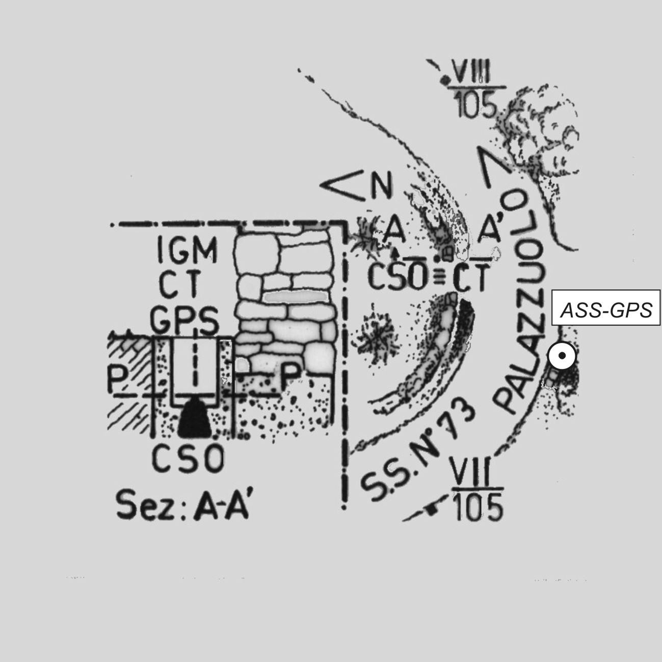 | Materializzazione | Centrino in acciaio inox del tipo "GPS D" infisso nella spalletta del ponticello di fronte all'ingresso carrabile del Podere Marocco, sul lato opposto della strada. |