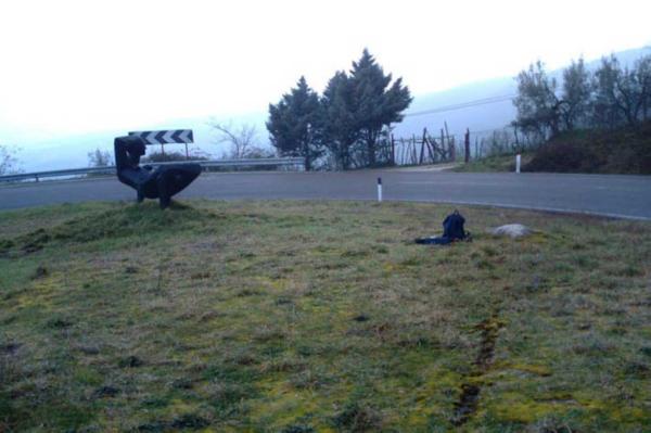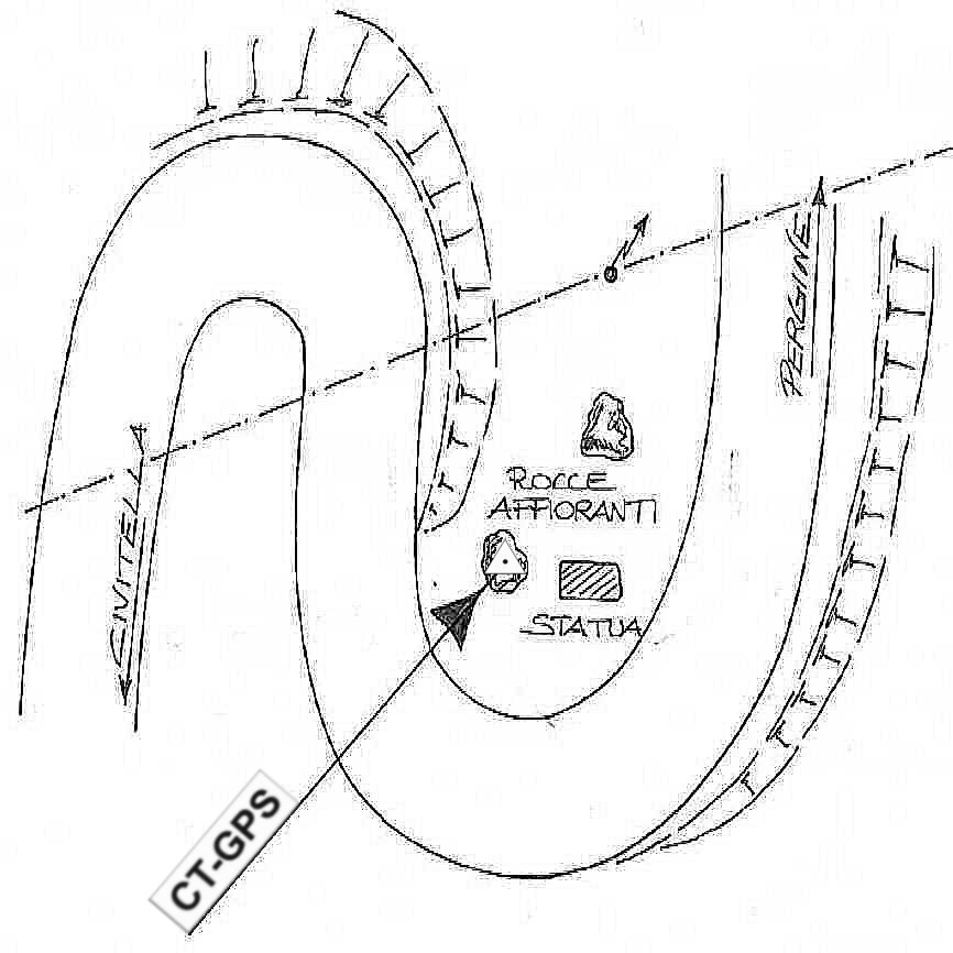| Materializzazione | Centrino in acciaio inox murato su roccia affiorante posta tra la statua ( donna in bronzo sdraiata ) e la strada che porta a Civitella, al penultimo tornante. |