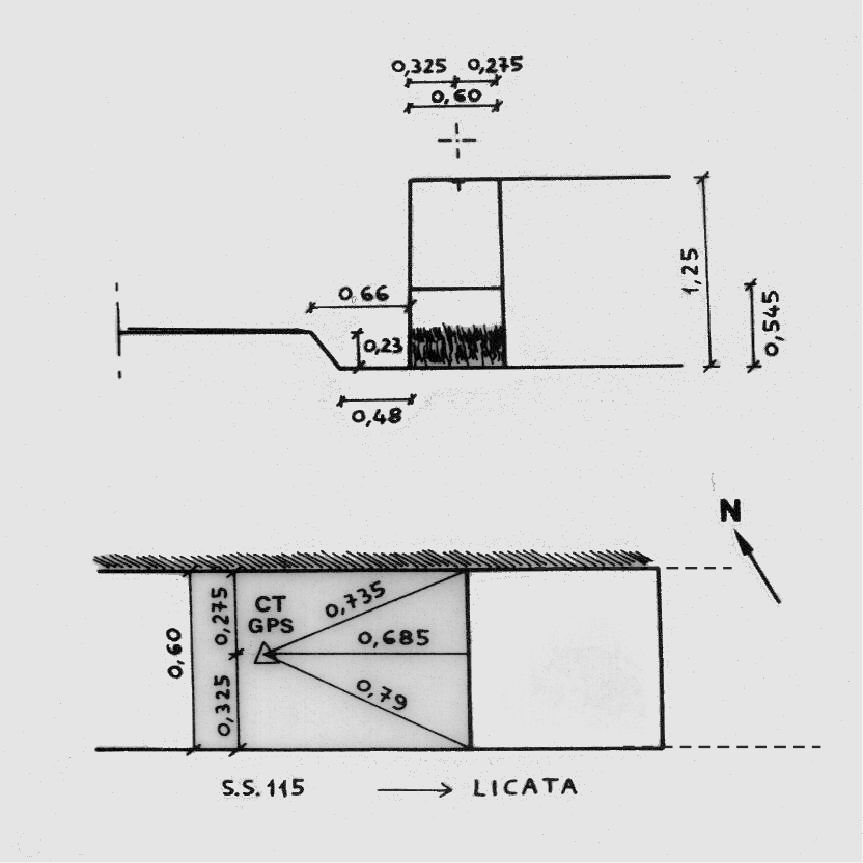 | materializzazione | Centrino di tipo "GPS C" fissato alla sommità di un muretto in cemento sul lato nord della S.S. 115 in prossimità di una cabina elettrica ENEL adiacente al Villaggio Giordano. |