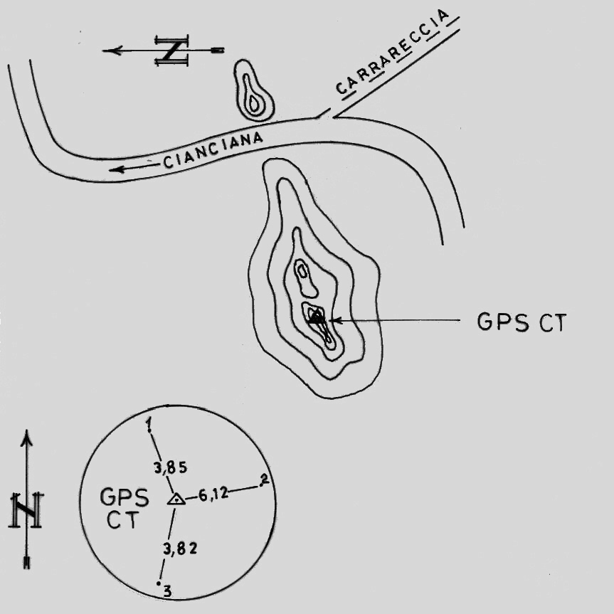 Centrino metallico della Regione Siciliana (CTR n. 629050) materializzato alla sommità rocciosa del pizzo. Riferimenti: n. 3 centrini metallici posizionati come da pianta.