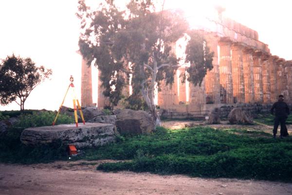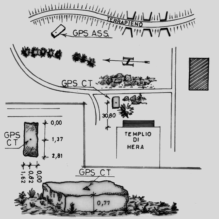 Centrino di tipo "GPS C" fissato su grosso macigno facente parte delle rovine del Tempio di Hera all'interno del parco archeologico.