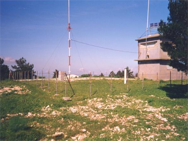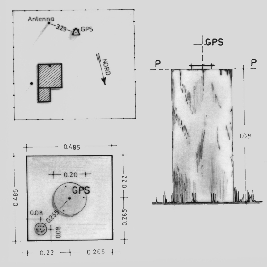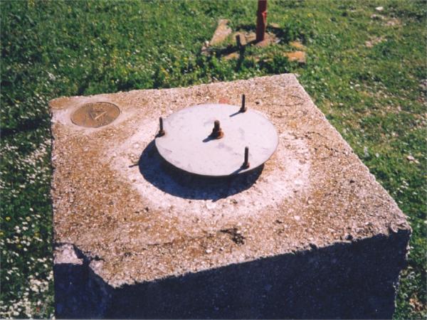 | materializzazione | Asse geometrico, materializzato da bullone metallico, della piastra di supporto per anemometro fissata alla sommità ed in prossimità del centro geometrico del pilastrino in muratura eretto nell'area prativa che si estende alla sommità del monte. |