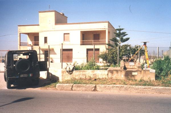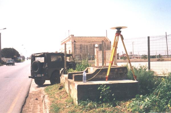 Centrino di tipo "GPS C" fissato sull'ala nord della platea in calcestruzzo di un pozzetto fuori terra della linea telefonica.