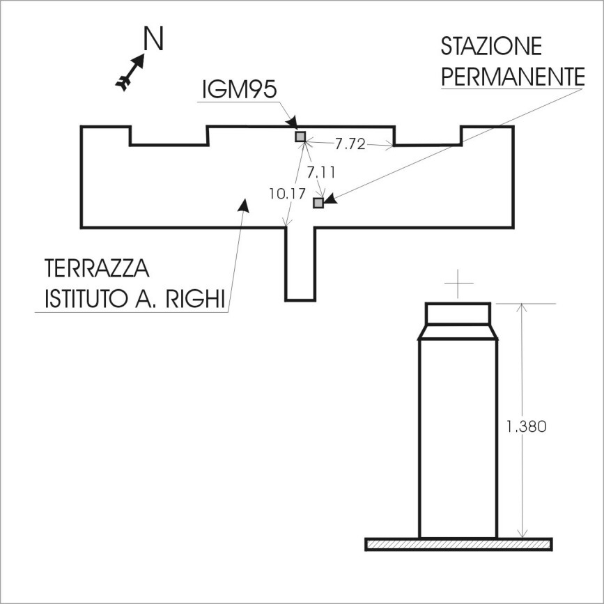 | materializzazione | Asse geometrico dell'impronta del vecchio centrino del catasto posto alla sommità di un pilastrino in calcestruzzo . Il pilastrino è quello più a nord dei due esistenti sulla terrazza sovrastante l'immobile sede dell'Istituto Tecnico per Geometri "A. Righi" in Via Trabocchetto II A. |