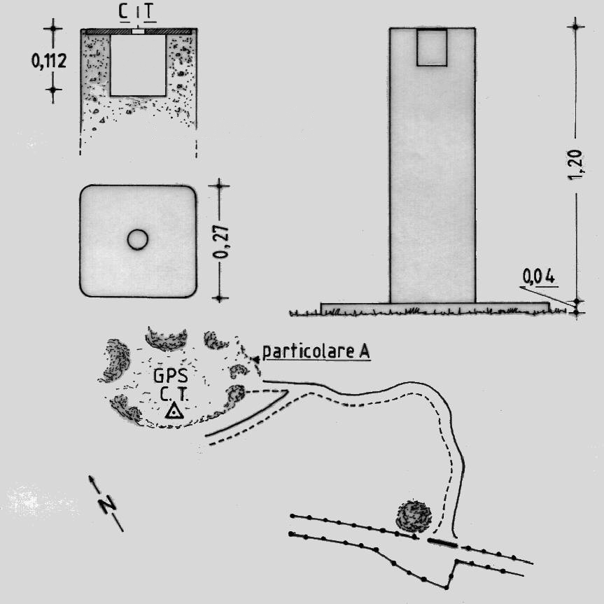 | materializzazione | Centro del foro filettato della piastra metallica materializzata alla sommità di un pilastrino in eternit a sezione quadrata con riempimento di calcestruzzo, in coincidenza dell'asse geometrico del pilastrino stesso, posto in cima alla collina "Timpone i Comuni" , a nord di Siano. |