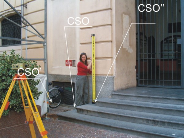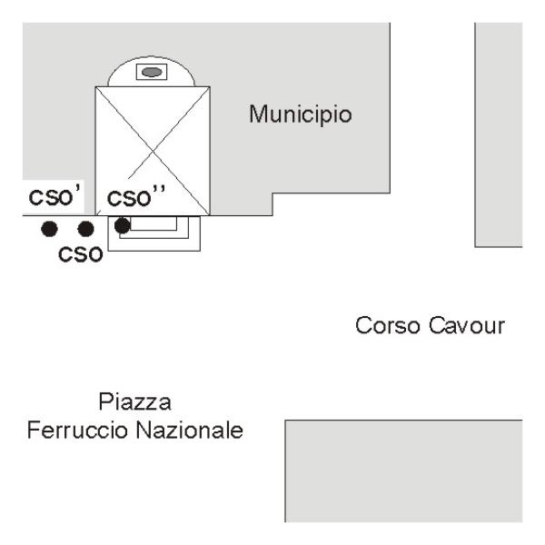 | Contrassegni | [{"simbolo_contrassegno":"P1","materializzazione":"(CSO) – Pozzetto in ghisa posto alla base della facciata, con a destra i gradini di accesso e a sinistra del CSO'."},{"simbolo_contrassegno":"P1","materializzazione":"(CSO') – Chiusino in ghisa alla base della facciata, a sinistra dei gradini di accesso e a sinistra del CSO. Il CSO' \u00e8 il B (basso) del CSO"},{"simbolo_contrassegno":"B2","materializzazione":"(CSO'') – Chiodo anonimo infisso sul 2\u00b0 gradino della scalinata, a sinistra della porta d'ingresso del Municipio"}] |