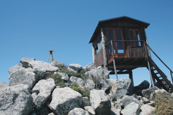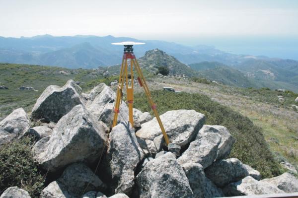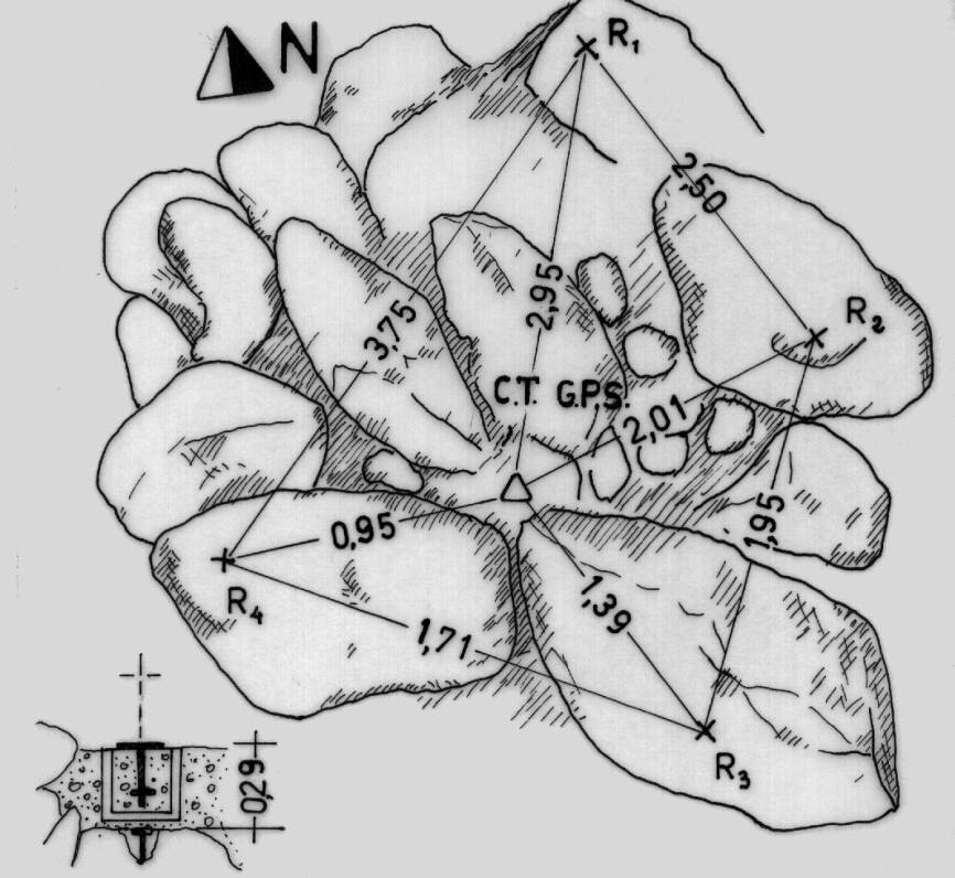 Centrino di tipo "GPS A" incastrato in centrino IGM del tipo di superficie cementato in un blocco cubico di calcestruzzo e sottostante coassiale centrino di fondo a sua volta cementato in una roccia granitica. Riferimenti: 4 croci incise su roccia.