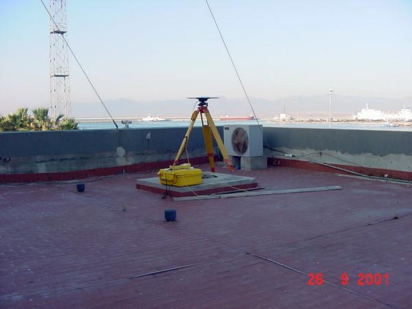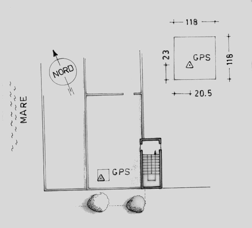 | materializzazione | Centrino in acciaio inox con gambo filettato fissato mediante collante su plinto in cemento (ex basamento di antenna) ubicato sulla terrazza alla sommità del lato sud-ovest della palazzina della Direzione Marittima della Capitaneria di Porto, ingresso laterale sud (alloggi). |