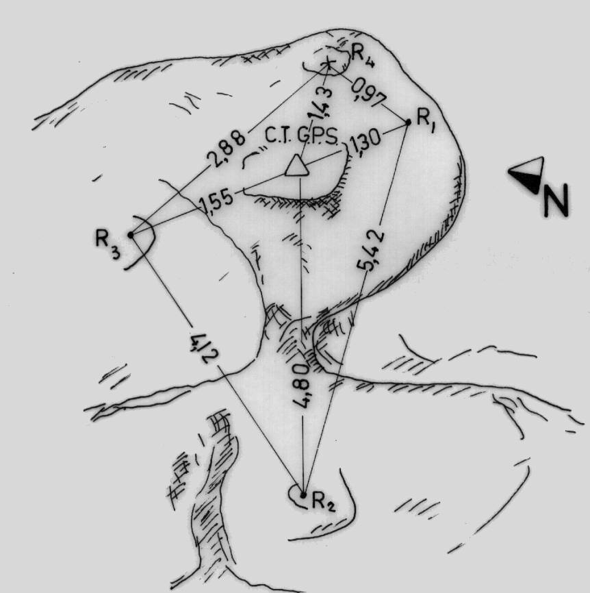 | materializzazione | Centrino del tipo "GPS A" fissato su centrino IGM del tipo di superficie cementato sul masso granitico esistente alla sommità dell'altura. Riferimenti: 3 centrini metallici (R1, R2, R3); 1 croce incisa (R4). |