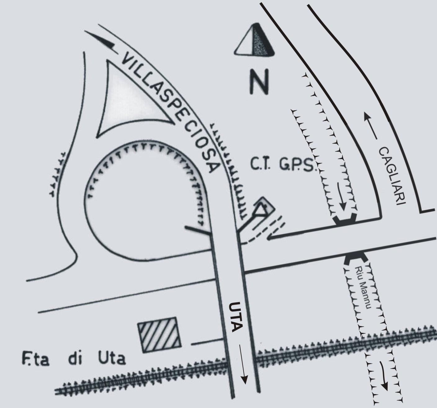 | materializzazione | Centrino di tipo "GPS C" fissato sull'estremo del prolungamento della spalla nord – est in calcestruzzo, del cavalcavia presso la fermata ferroviaria di Uta. |