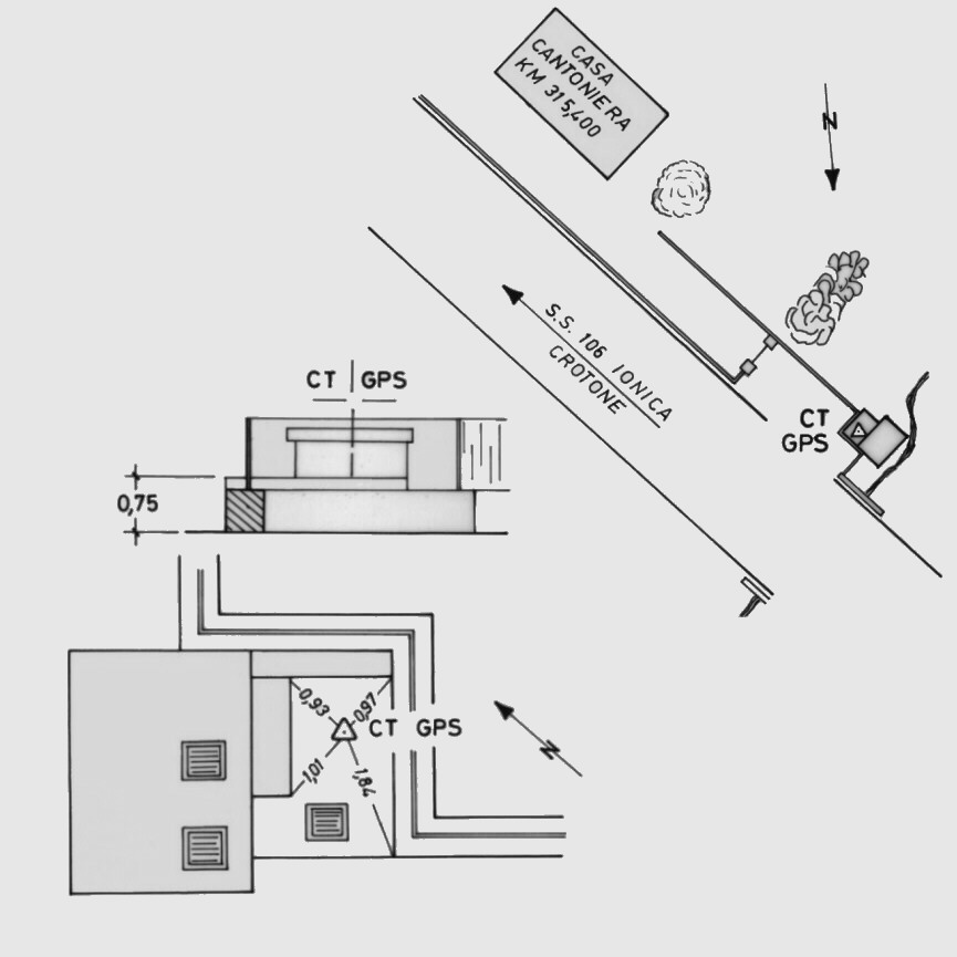 | materializzazione | Centrino di tipo "GPS C" fissato sulla soletta di cemento armato del tombino della fognatura. |