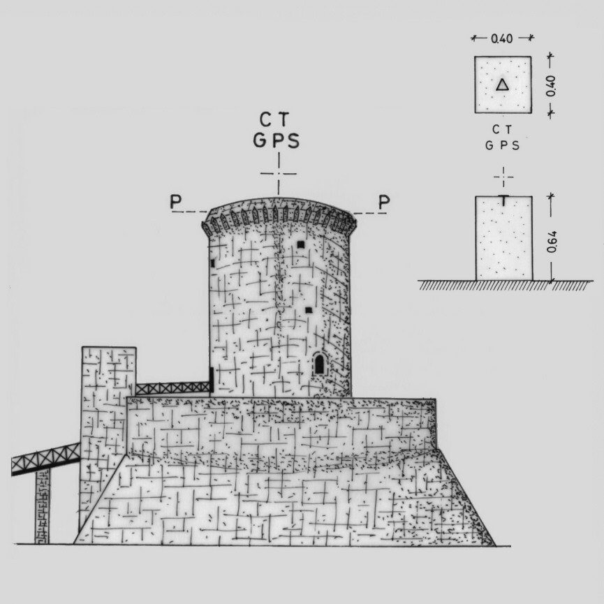 | materializzazione | Centrino di tipo "GPS A" fissato su preesistente centrino IGM, del tipo di superficie, cementato alla sommità di pilastrino in muratura, posto sulla terrazza a copertura della torre in corrispondenza del suo asse geometrico. |