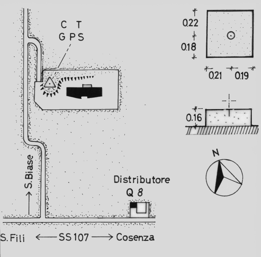 | materializzazione | Centrino di tipo "GPS C" fissato alla sommità del pilastrino in cemento, posto sulla cima del colle all'interno di una recinzione dell'acquedotto, adiacente ad una grossa struttura in cemento. |