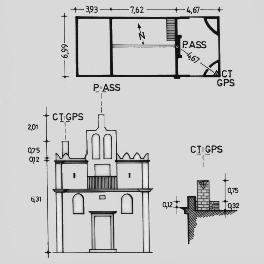 | materializzazione | Centrino di tipo "GPS A" fissato su preesistente centrino IGM del tipo di superficie, cementato alla sommità di un pilastrino di mattoni, in corrispondenza del suo asse geometrico e sottostante croce incisa sulla copertura; il pilastrino è ubicato sulla torretta in corrispondenza dello spigolo sud-est del frontone della Cappella di San Salvatore. |